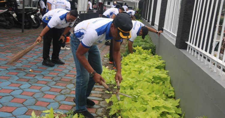Sejak pagi, para pegawai terlihat antusias membersihkan berbagai sudut halaman, mulai dari menyapu area terbuka, memangkas rumput liar, membersihkan selokan, hingga merapikan taman. Dengan semangat gotong royong, kegiatan ini berjalan lancar dan penuh kekompakan.