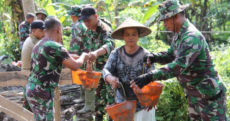 Puluhan prajurit TNI bersama warga sekitar lokasi saling bahu membahu dan semangat dalam perakitan material besi untuk dudukan pondasi beton sebagai dasar penopang jembatan.
