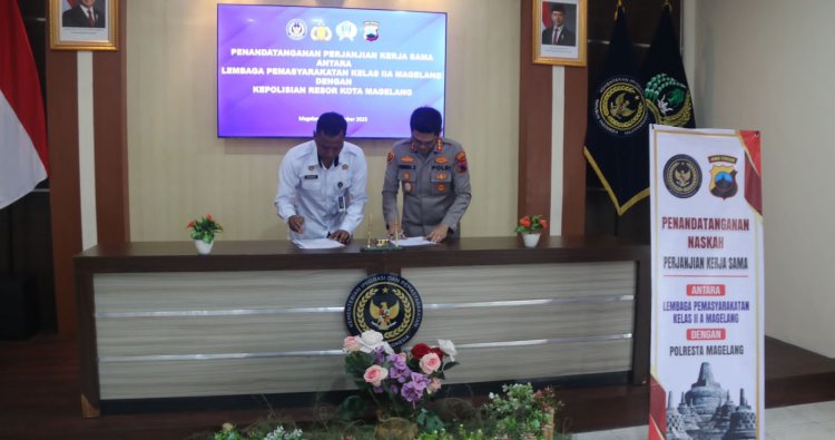 Magelang - Kepala Lembaga Pemasyarakatan (Kalapas) Magelang bersama Kapolresta Magelang secara resmi menandatangani Perjanjian Kerja Sama (PKS) sebagai bentuk penguatan sinergi antar aparat penegak hukum, Kamis 18/12/2025 di Aula Sahardjo Lapas Magelang.